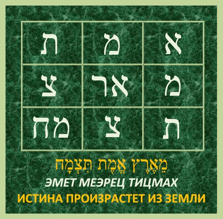 Удивительная находка мудрецов Израиля на этот стих. Недавно я узнал что слова 12 стиха 84 псалма אֱמֶת מֵאֶרֶץ תִּצְמָח (эмет меэрец тицмах) — «Правда произрастет из земли», (которые в таинственном аспекте говорят о вочеловечивании Слова Всевышнего на земле), удивительно вписывается в шесть ячеек таблицы так, что читается Сверху вниз и справа налево - Горизонталь и вертикаль Креста. Земля и Небо. А Центр ИСТИНА которая произрасла из земли. И таким образом эта фраза прочитывается являя на все стороны вселенной тайну Святого Израилева, Который Стал Искупителем и Спасителем народов на земле. Ведь ИСТИНА возникающая из ЗЕМЛИ есть рождение Машиаха Йешуа, а ПРАВДА приникающая с Небес – это Живая ТОРА – Премудрость и Слово Всевышнего вочеловечивающаяся в нашем мире.