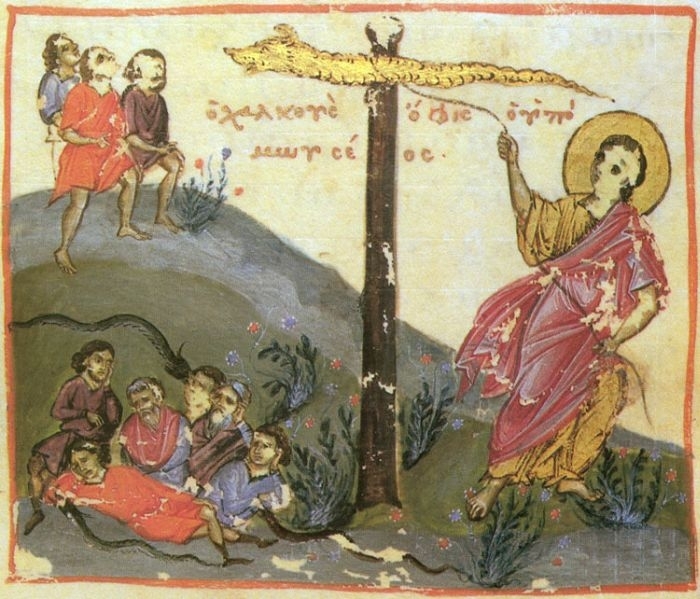 9 И сделал Моисей медного змея и выставил его на знамя, и когда змей жалил человека, он, взглянув на медного змея, оставался жив. (Чис.21:6-9)