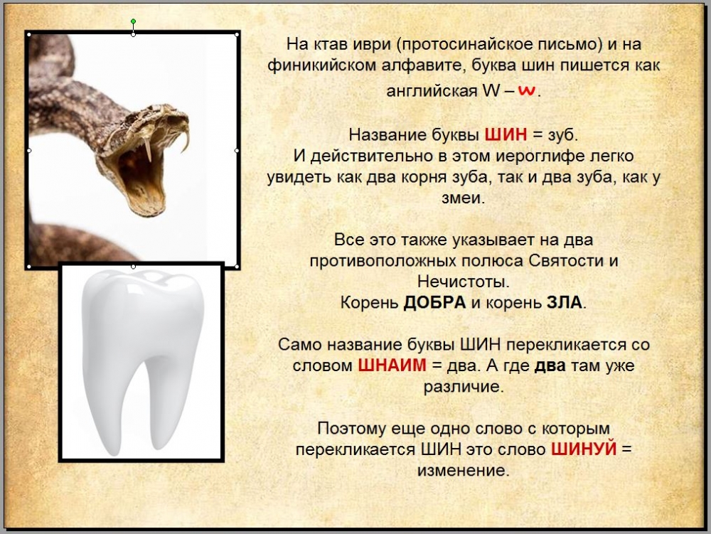 Первый образ это два зуба. Зуб НАХАША – Змея Нечистоты кусает человека и פרך = ПЕРАХ = ломает, и ПАРЕХ = жестоко порабощает непосильными работами. Зуб МАШИАХА – Змея Святости кусая человека, כפר = КАПЕР = восстанавливает, очищает, исцеляет его. Самому названию буквы ШИН созвучно и слово ШИНУЙ = изменение. Христос изменяет нас, исцеляя через Свои болезни. Он ШИНУЙ = меняет, изменяет нашу поврежденную природу.