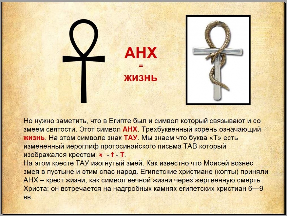 [47] Но нужно заметить, что в Египте был и символ который связывают и со змеем святости. Этот символ АНХ. Трехбуквенный корень означающий жизнь. На этом символе знак ТАУ. Мы знаем что буква «Т» есть измененный иероглиф протосинайского письма ТАВ который изображался крестом. На этом кресте ТАУ изогнутый змей. Как известно что Моисей вознес змея в пустыне и этим спас народ. Египетские христиане (копты) приняли АНХ – крест жизни, как символ вечной жизни через жертвенную смерть Христа; он встречается на надгробных камнях египетских христиан 6—9 вв. Что касается дохристианской археологии, то по свидетельству археологов в Египте была найдено лишь одна надпись египетскими иероглифами написанная на семитском (еврейском языке), а не на египетском наречии. Эта надпись была заклинанием против ядовитых змей. В этой надписи прослеживается намек на библейские слова о проклятии змея которому определено Богом есть только землю… «Израильские ученые сумели расшифровать магическую надпись, которая была обнаружена в пирамиде фараона Униса, построенной в XXIV веке до н.э. Выяснилось, что иероглифы содержали заклинания против змей. По словам специалистов, это древнейшая в мире надпись на семитском языке. Цепочка странных иероглифов была обнаружена еще в 2002 году американским профессором Реувеном Штайнером. Она была выбита на одной из стен пирамиды - в непосредственной близости от саркофага с мумией фараона. Однако никто из египтологов не мог понять, какое именно послание зашифровано в тексте. Постичь тайный смысл удалось лишь после того, как фотография надписи была передана в иерусалимскую Академию языка иврит. Ее руководитель, профессор Моше Бар-Ашер пришел к выводу, что текст выполнен на древнем семитском языке, хотя и записан иероглифами. После этого ему не составило особого труда прочесть и само заклинание: Хлеб отца твоего – тебе, пусть атака твоя пройдет мимо цели.