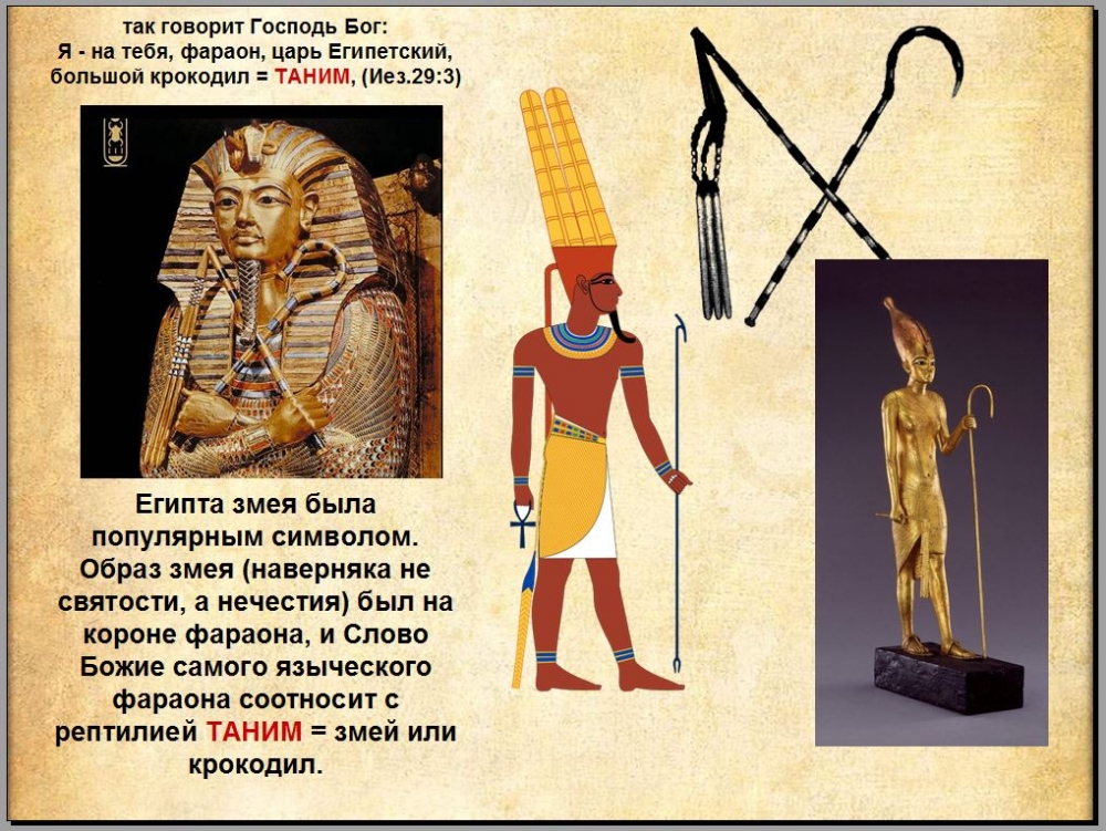 В основном эти символы имею далекое от библейской истории объяснение. Например змея на шесте – Посох Асклепия, Два змия на посохе – кадуцей Гермеса. Змий над чашей – чаша Гипократа. Но библейский символ спасения и жизни навсегда вошел медицинские символы даже язычников. Если говорить о язычниках, то в языческих культах Египта змея была популярным символом. Образ змея (наверняка не святости, а нечестия) был на короне фараона, и Слово Божие самого языческого фараона соотносить с рептилией ТАНИМ = змей или крокодил. У фараона, если посмотреть на посмертные саркофаги мумий имелись жезлы с крюком и полосатой расцветкой напоминающие расцветку змей.[47] Есть мнения что египетские жрецы имели посохи в виде змей или даже высушенных или загипнотезированых змей. Тора доносит до нас, что жезлы жрецов ожили когда посох Аарона превратился в змею.