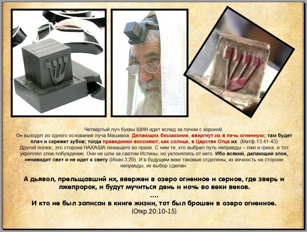 Но есть в иудейской традиции случай, когда буква ШИН меняет свою обычную форму. Из трехглавой, она превращается в четырехглавую. Четырехглавая ШИН изображается только на головном ТФИЛИНЕ и только с левой стороны. С правой же стороны коробочки (БЕЙТ = дом[42]) тфилина пишется обычная, трехглавая ШИН. В этом тайна и аллюзия на два века ОЛАМ А-ЗЕ и ОЛАМ А-БА. Р. Ицхак Гинзбург пишет: Согласно Каббале,[43] трехглавая буква Шин принадлежит этому миру, а четырехглавая – Миру Грядущему. Такой вид буквы – требование одного из законов, полученных евреями от Моисея.