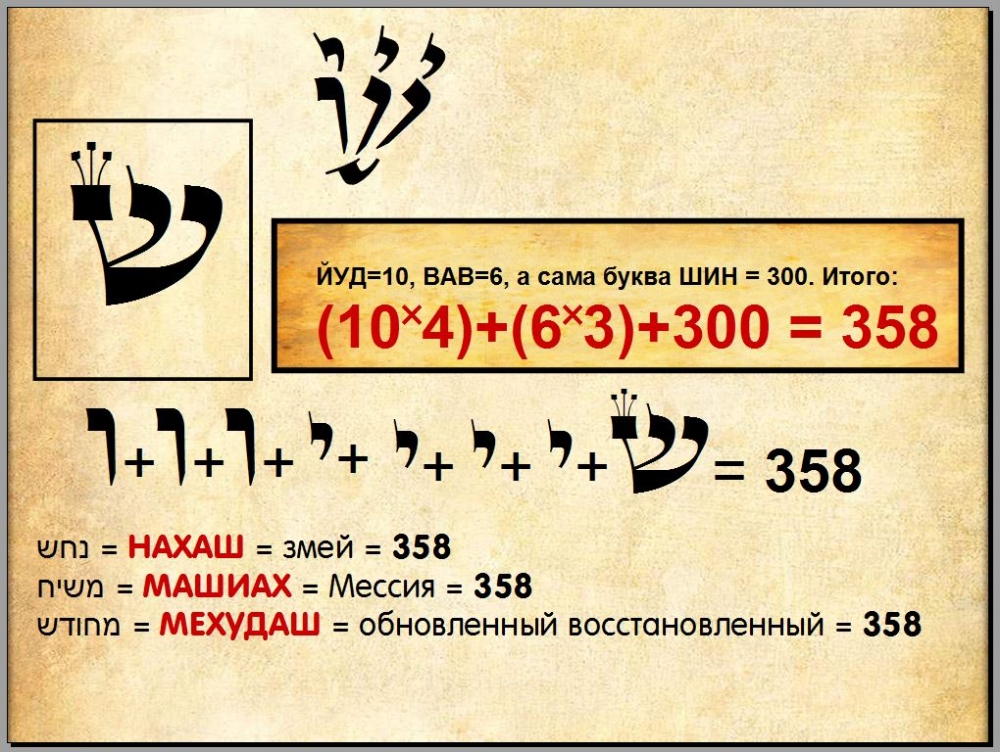 Но как было уже упомянуто выше, кроме числа 300, букве ШИН в иудейской традиции приписывают другое числовое значение = 358.