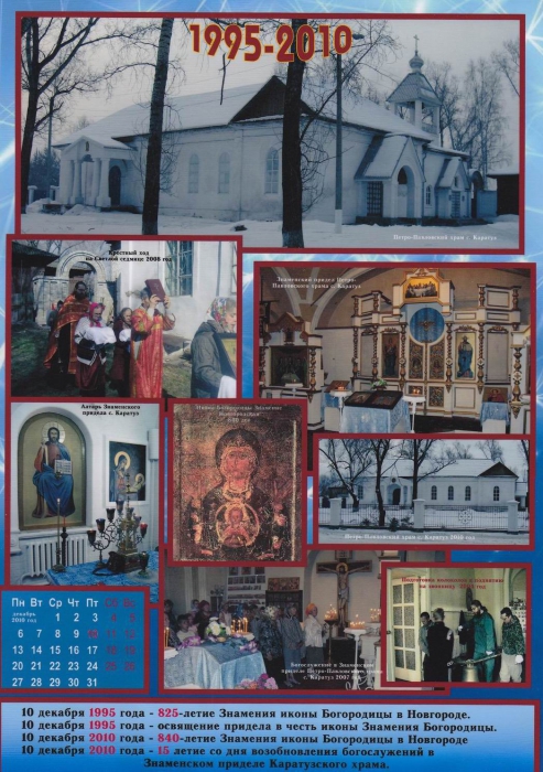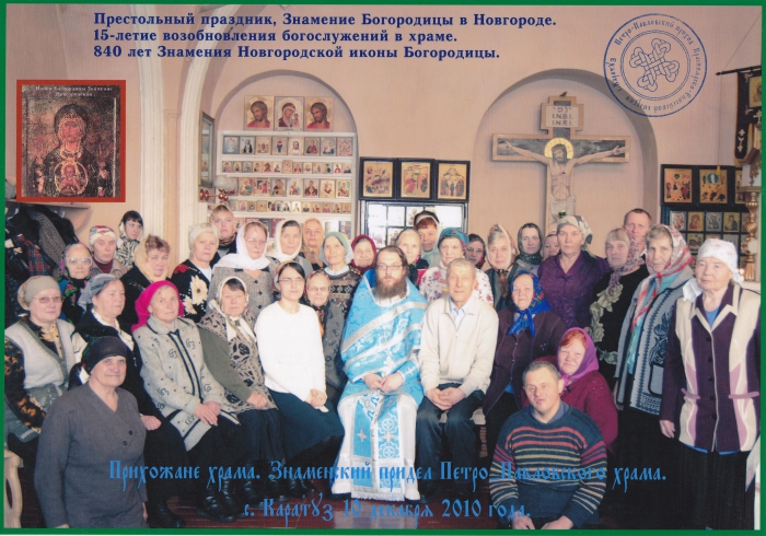 10 Декабря 2010 года была совершена юбилейная литургия престольного праздника Знамения Богородицы. В этот день праздновалось 15 летие возобновления богослужений в Каратузском храме и 840 летие Знамения Богородицы в Новгороде. К сожалению очень многие из прихожан храма не смогли прийти на службу так как день был рабочим. По окончании литургии всем молящимся были подарены памятные календари и диски с душеполезными аудиопоучениями. Была сделана общая фотография пришедших на праздничное богослужение.