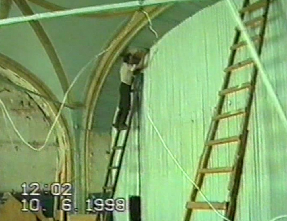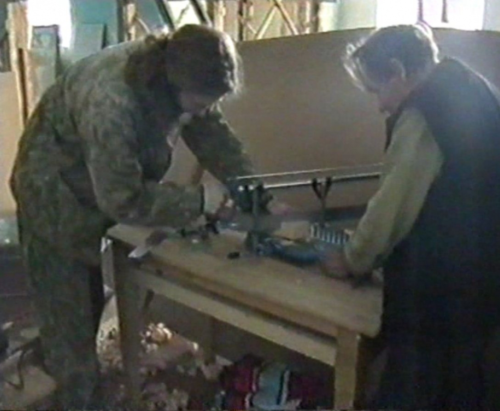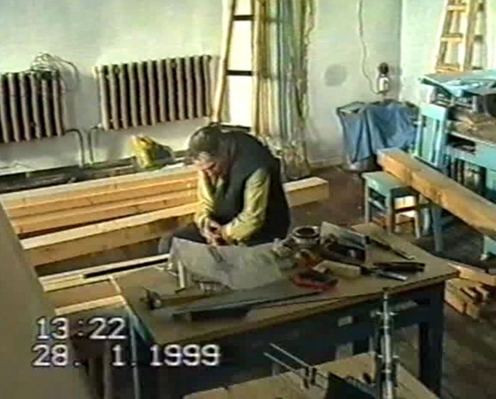 Димитрий Иванович выбирает четверь (вручную - тогда у нас станков небыло) на брусьях (которые пожертвовал покойный Николай Усатов) на стояках иконостаса под двери.