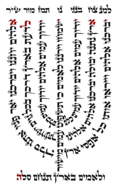 [1] Каббалисты считали, что длина строк 67-го псалма позволяет, в переносном смысле, уподобить ее форме меноры. Первая строка, это название, и оно тянется во всю ширину светильника, помечая семь лампад. Четвертая, средняя строка является самой длинной, и образует собой центральный ствол и длинное основание-подставку. Первая и седьмая строки являются следующими по длине, и представляют собой наружные боковые ветви. Внутренние ветви образуют четыре оставшихся строки одинаковой длины. Все вышесказанное, разумеется, релевантно исключительно для текста на иврите. (Я-Тора)