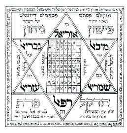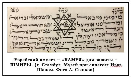 Для примера можно рассмотреть камею (амулет) который выставлен в музее при синагоге Нэвэ Шалом г. Стамбул. На ней изображен «Щит Давида» с написанным в центре именем ШАДАЙ. По объяснению А. Сыпкова, в шесть треугольников-лучей гексаграммы вписаны шесть букв, которые составляют фразу из шести букв МаГеН ДаВиД (по часовой стрелке). Внутри звезды – Имя ШаДаЙ, а между лучей первые два Имени из Имён, которые зашифрованы в молитве Ана бе-хоах (אב''ג ית''ץ).[33] При этом первое Имя (אב''ג) записано против часовой стрелки, а второе (ית''ץ) – по часовой. Текст камеи упоминает четырех ангелов: «Справа от меня Михаэль, и слева Гавриэль; И передо мной Уриэль, и сзади меня Рефаэль; И над головой моей Шхина Бога; Ибо ангелам Своим заповедано о тебе хранить тебя во всех путях твоих. Господь сохранит тебя от всякого зла, сохранит душу твою».