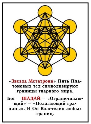 «Звезда Метатрона» Пять Платоновых тел символизируют границы тварного мира. Бог – ШАДАЙ = «Ограничивающий» = «Полагающий границы». И Он Властелин любых границ.