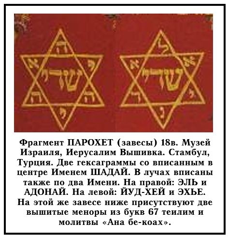 Фрагмент ПАРОХЕТ (завесы) 18в. Музей Израиля, Иерусалим Вышивка. Стамбул, Турция. Две гексаграммы со вписанным в центре Именем ШАДАЙ. В лучах вписаны также по два Имени. На правой: ЭЛЬ и АДОНАЙ. На левой: ЙУД-ХЕЙ и ЭХЬЕ.
